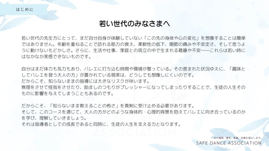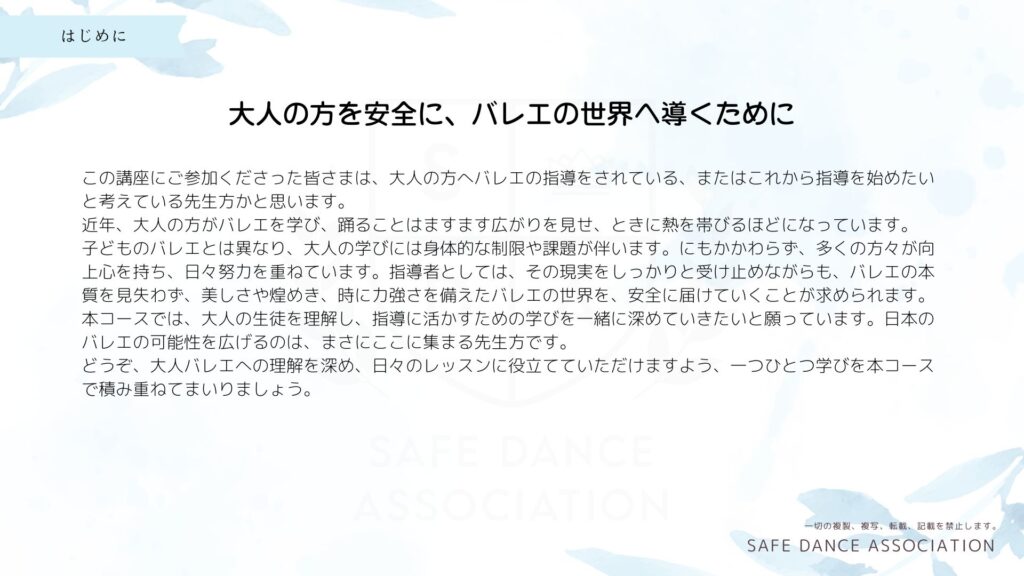 大人の学びを安全かつ豊かなものに導くために、バレエ指導者としての新しい視点と技術が求められています。